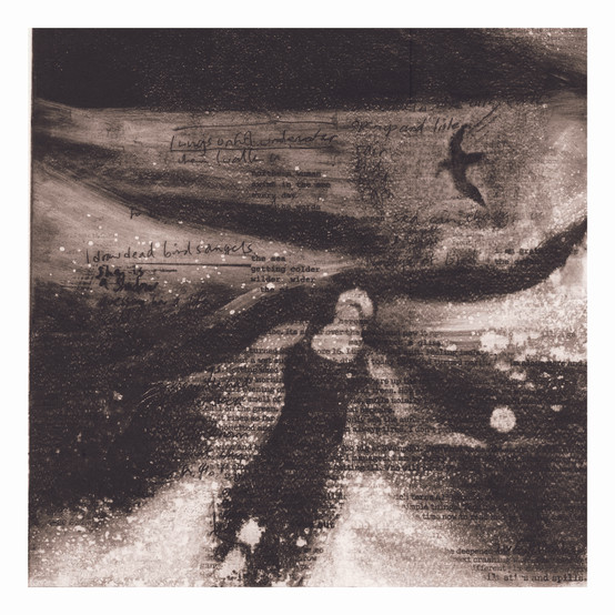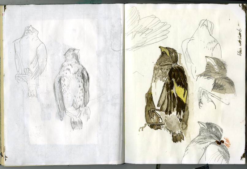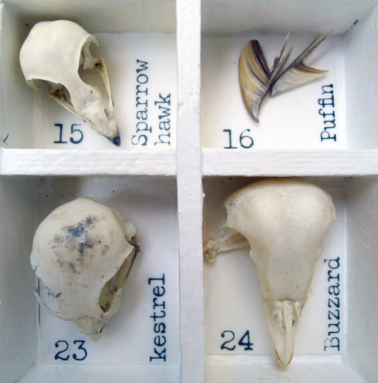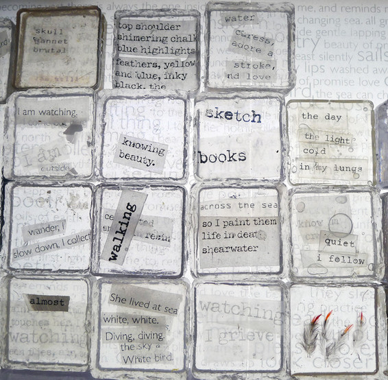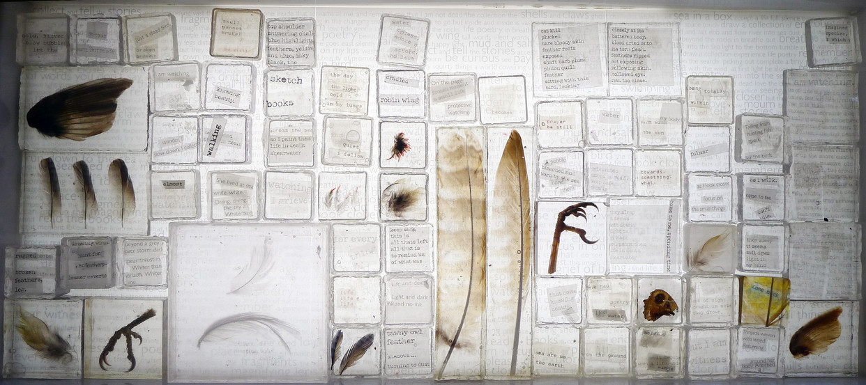 A fold out guide is placed on a table in the corner of the room. It takes you to an old wooden bureau containing sketchbooks and draws full of bird skulls, natural objects, resins poems and books. You are then led to the concertina sketchbooks opened up along long shelves, records of a time spent, then to etchings and monotypes on the walls, and finally to a block of resin and light. You are invited to sit, open draws, explore, pick up objects and read.
